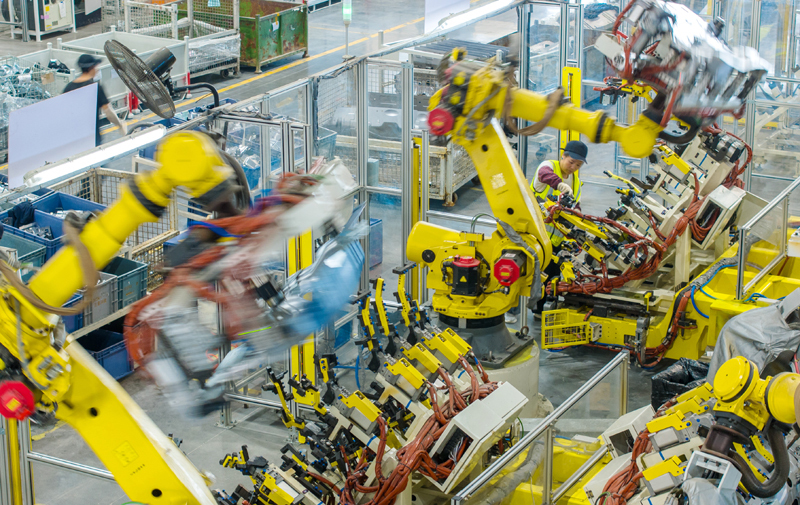 2025年10月9日,浙江省湖州市长兴经济技术开发区一家汽车部件有限公司的技术人员操控工业机器人生产新能源汽车配件(无人机照片)。新华社发(谭云俸 摄)